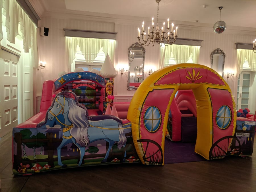There is a mini bouncy castle, inflatable slide, ball pit and balls, air jugglers. Comes with a selection of soft play shapes inside play park.