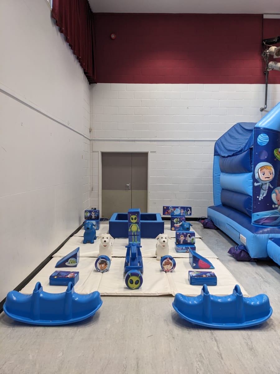 Our new space themed softplay set up comes with shapes , ball pit, balls, mats. We add in hoppers, rockers, seasaws