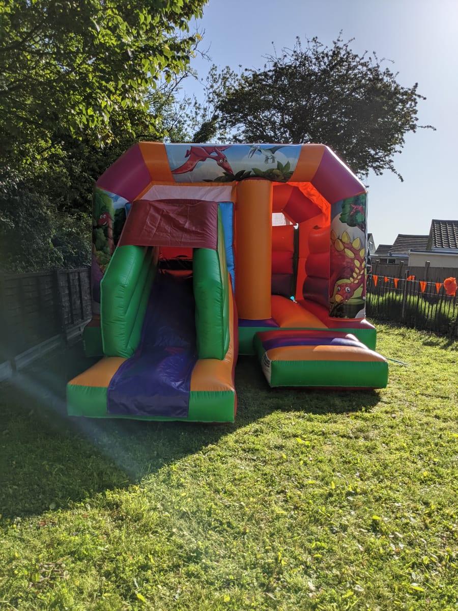 Our bright multi coloured bounce and slide dinosaur castle available to hire for any indoor or outdoor party.