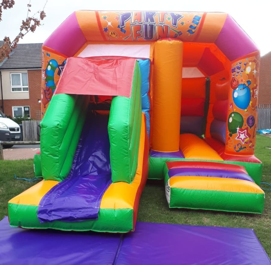 Our Multi Coloured Party Time Front Slide Castle Available to hire.