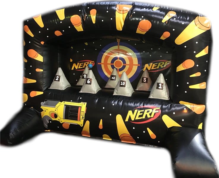 This Nerf shootout inflatable uses the same technology seen in air juggler ball pools to keep a soft play ball suspended in mid-air. Players then use their Nerf guns to shoot at the ball to knock it away from the air stream keeping it afloat.