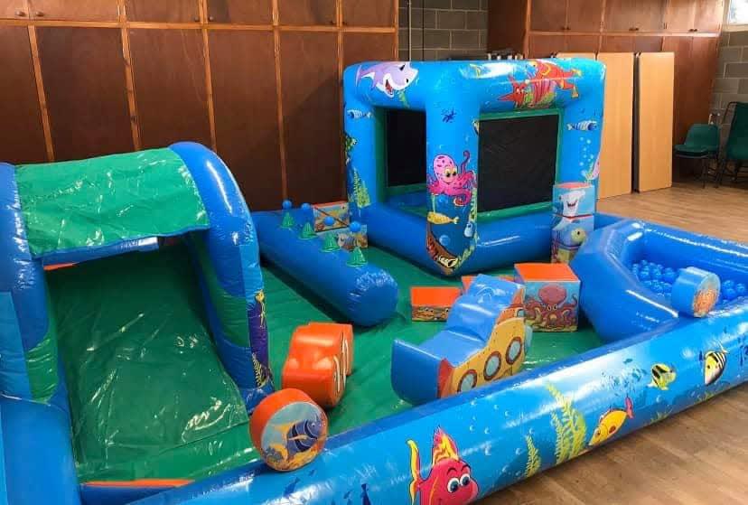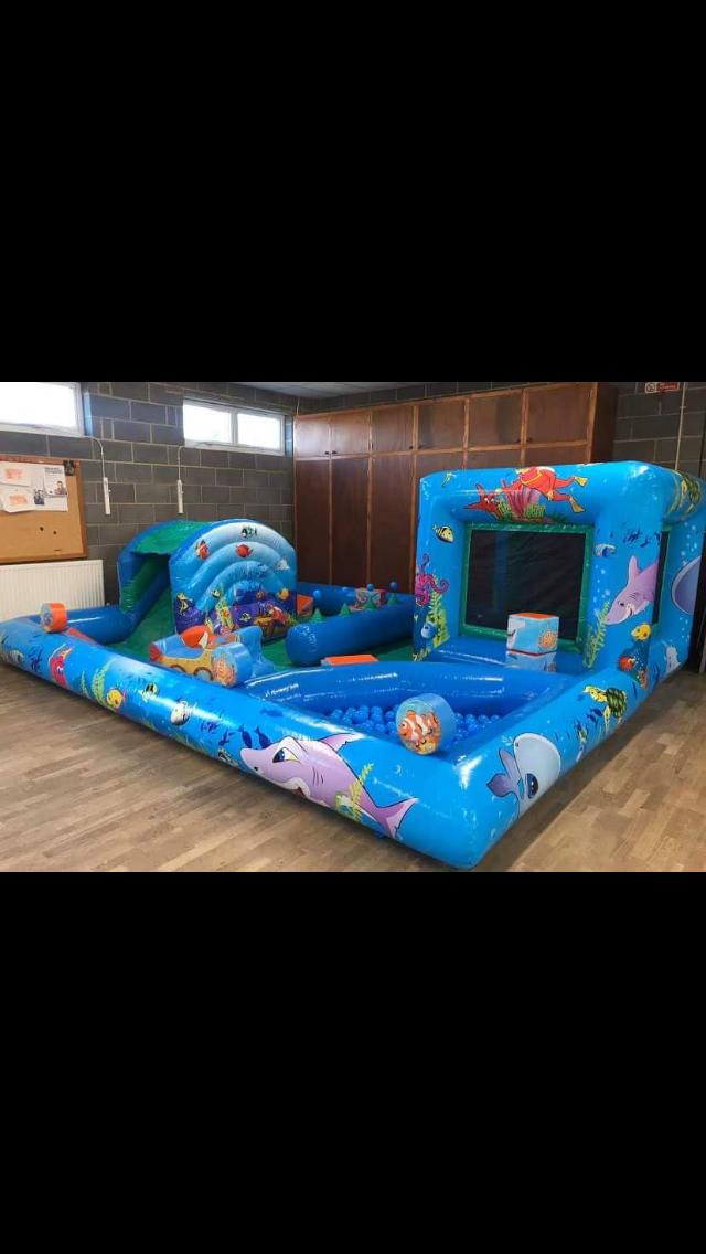 There is a mini bouncy castle, ball pit, air jugglers and inflatable slide arch. Play zone comes with soft play shapes inside .